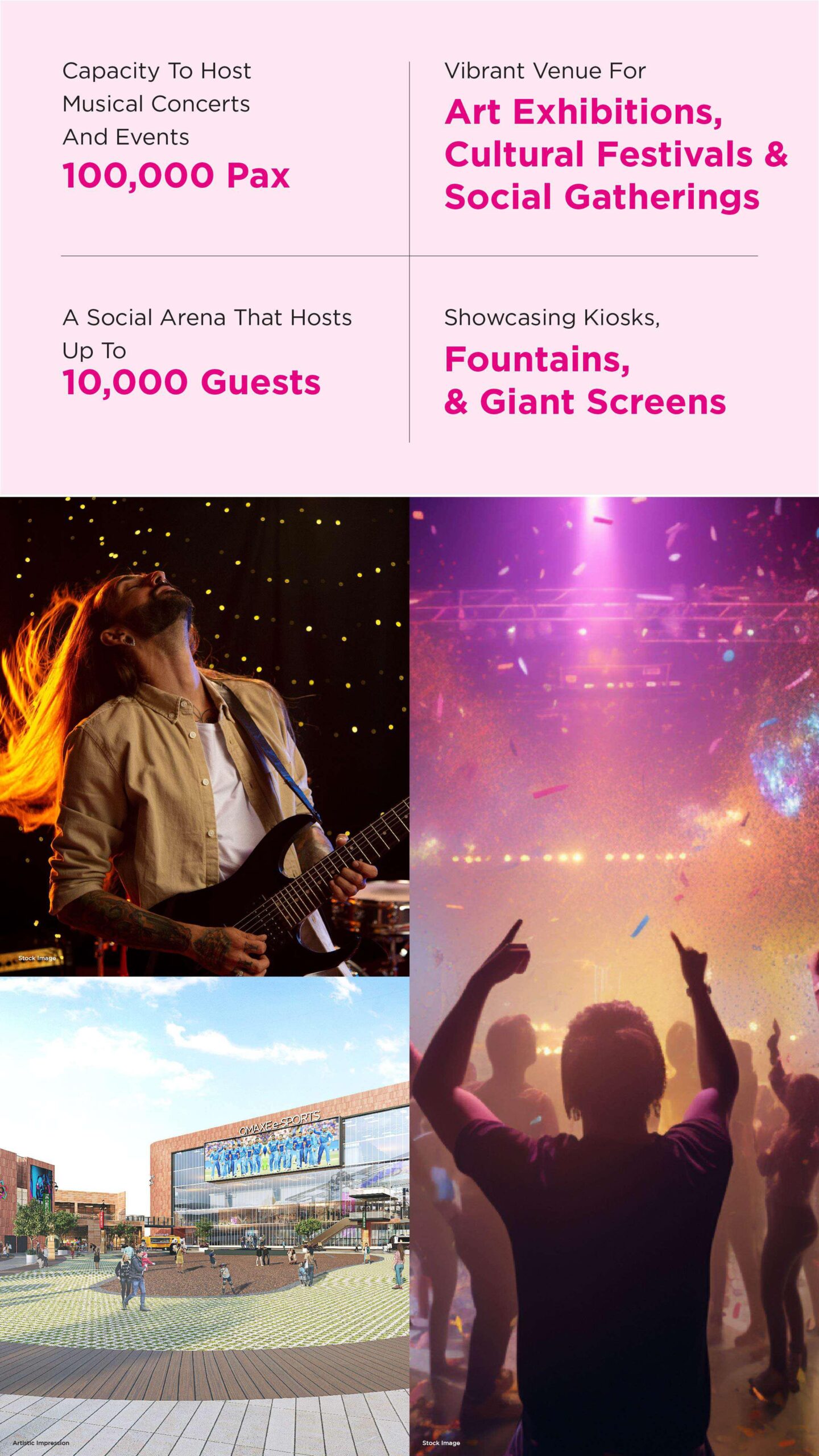 A 40,000-seat cricket-cum-football stadium (with a hydraulic pitch and 72 corporate boxes), plus indoor sports facilities for kabaddi, tennis, and more A multi-use hybrid retail precinct featuring 3.5 acres of plaza, over 4.5 km of air-conditioned retail front, and around 700,000 sq.ft. of shop and leisure space. World-class amenities including a 75,000 sq.ft. e-sports arena, 6–7 screen multiplex, rooftop restaurants and lounges, banquet spaces, and a members-only club.